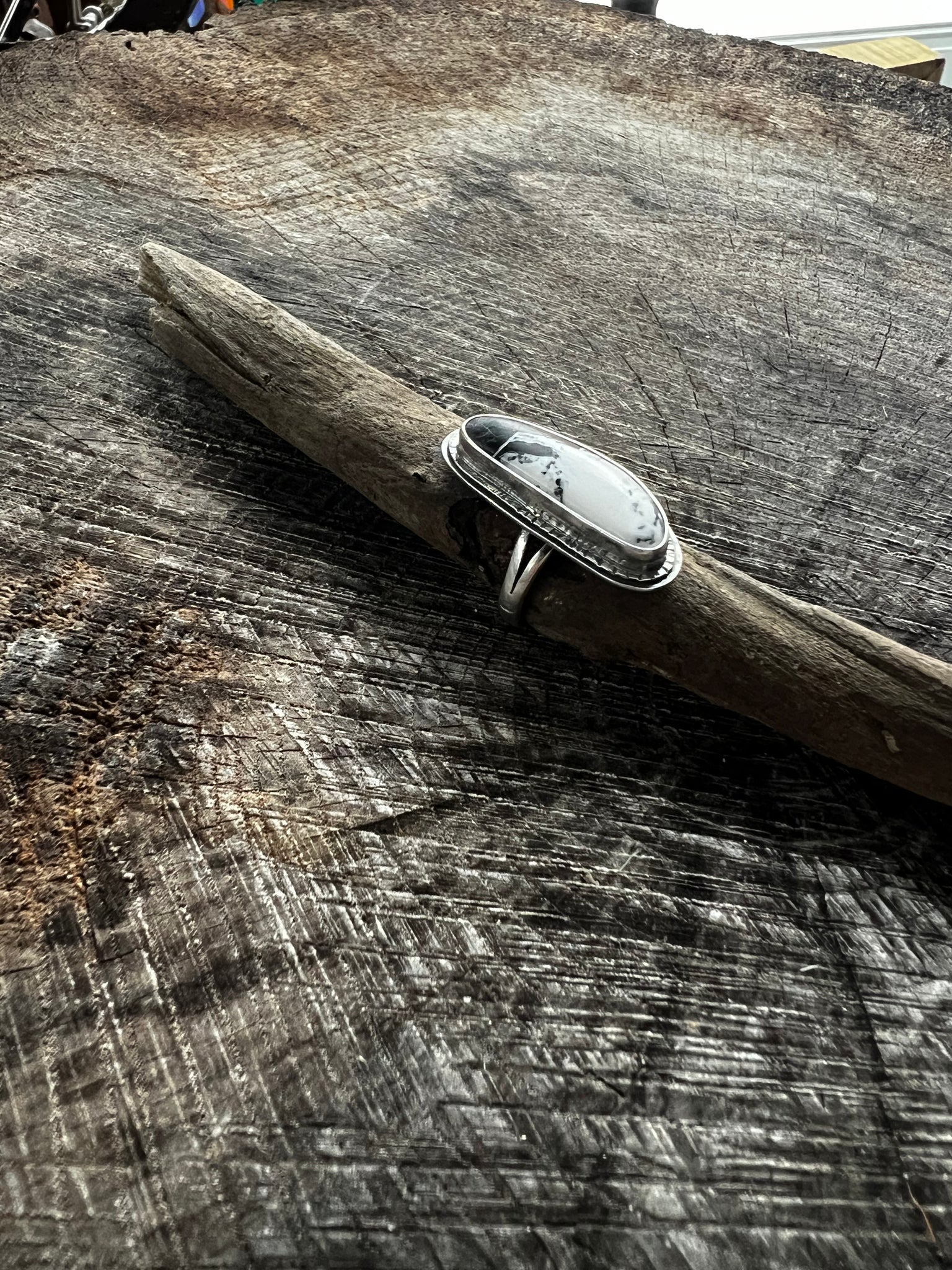 White Buffalo set in fine and sterling silver on a raised textured stage. Hand built and made to last. Fits a size 6.25.